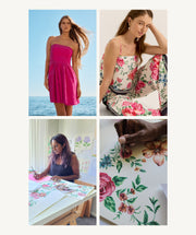 Her exclusive hand-painted print comes to life in a collection of flattering silhouettes, each piece infused with a nostalgic nod to bold colour and feminine energy. The result is a capsule that